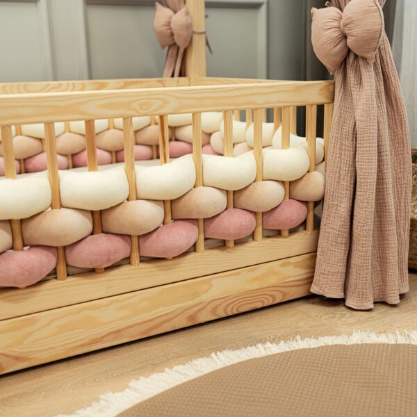Jest to produkt do samodzielnego wplecenia między szczebelki łóżeczka, świetnie sprawdza się kiedy chcemy mieć wielokolorowy ochraniacz. Długość wybrana przez klienta (+/- 5%).