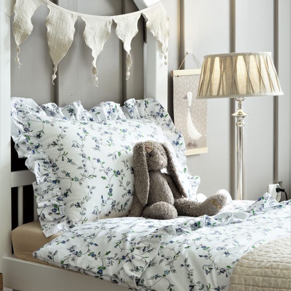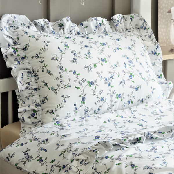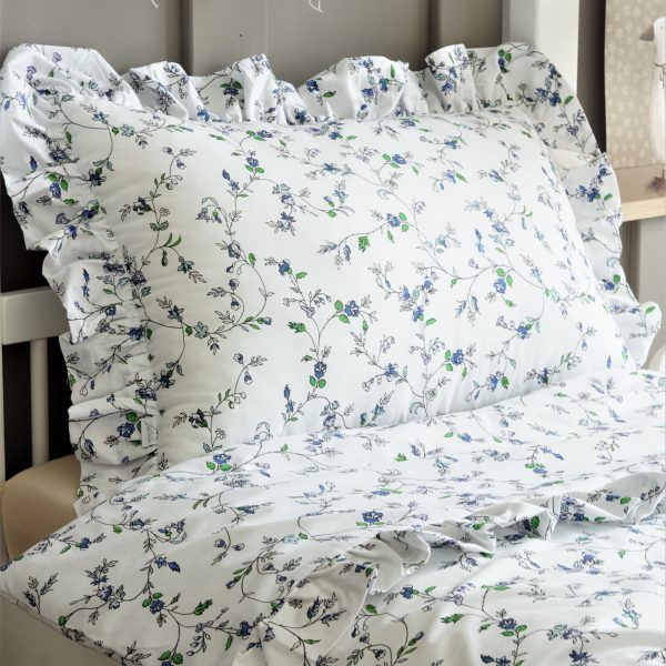 Pościel bawełniana Biała W Niebieskie Kwiatki Z Falbaną