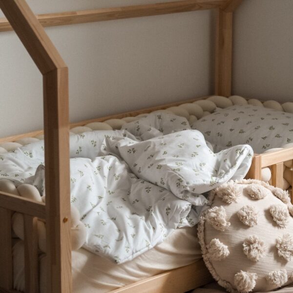 Miękka i delikatna pościel z wypełnieniem w kolorze białym w zielone listki z falbaną z bawełny PREMIUM.