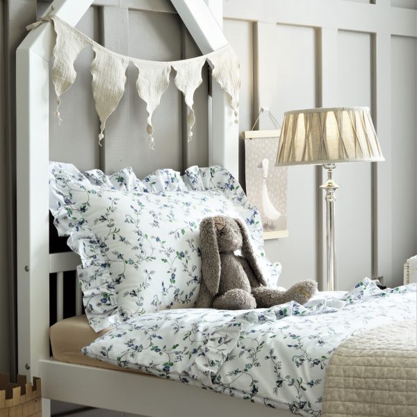 Pościel bawełniana Biała W Niebieskie Kwiatki Z Falbaną
